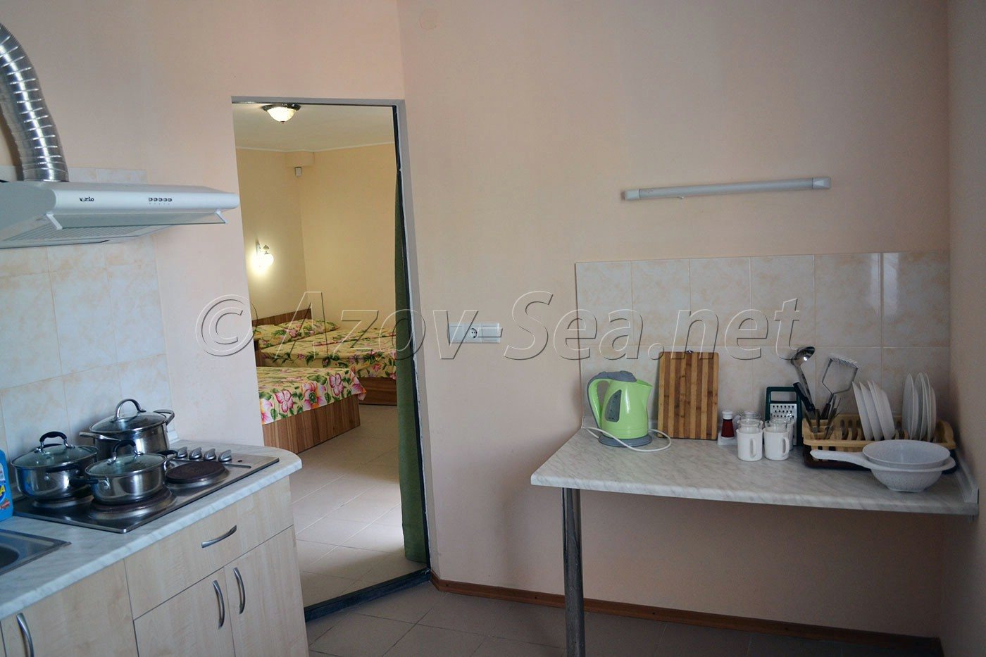 Одна большая общая кухня на 2 люкс номера расположена рядом с номером. Важно отметить, что на кухне есть 2 отдельные рабочие поверхности и отдельная посуда для каждого номера. На кухню имеется отдельный вход с каждого номера, который надёжно запирается изнутри.