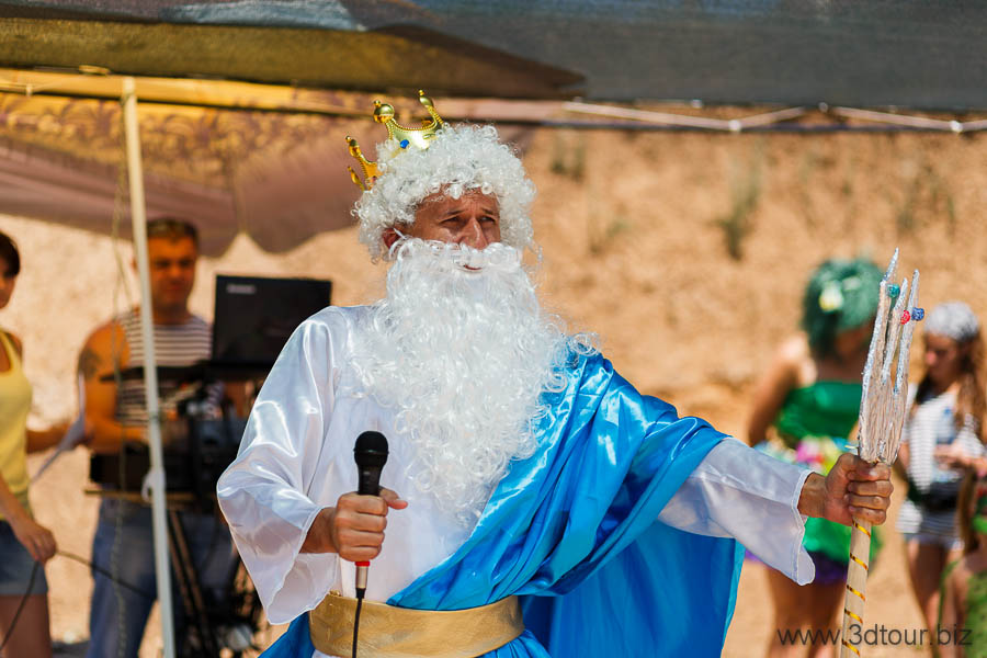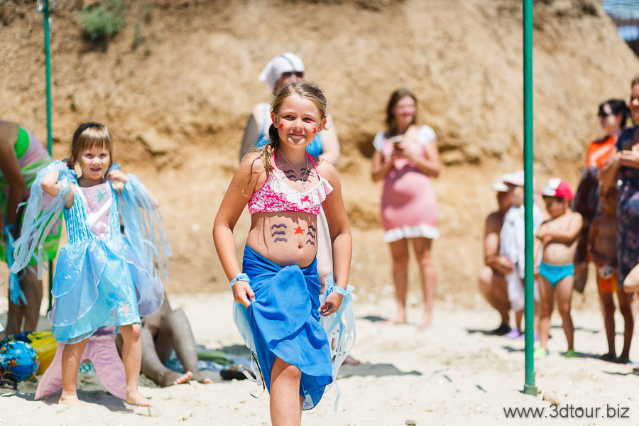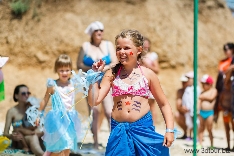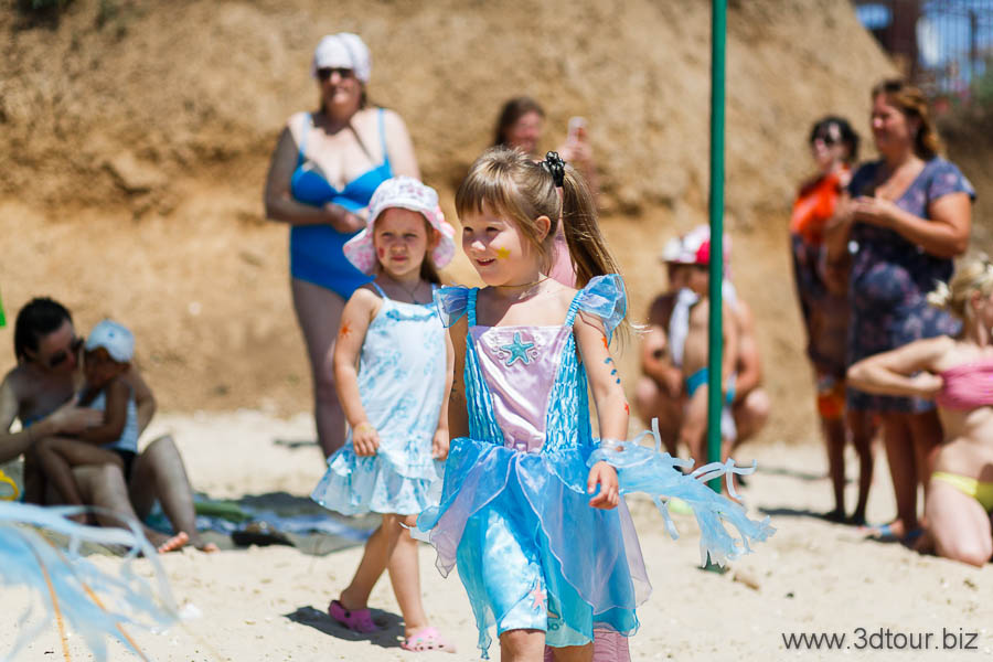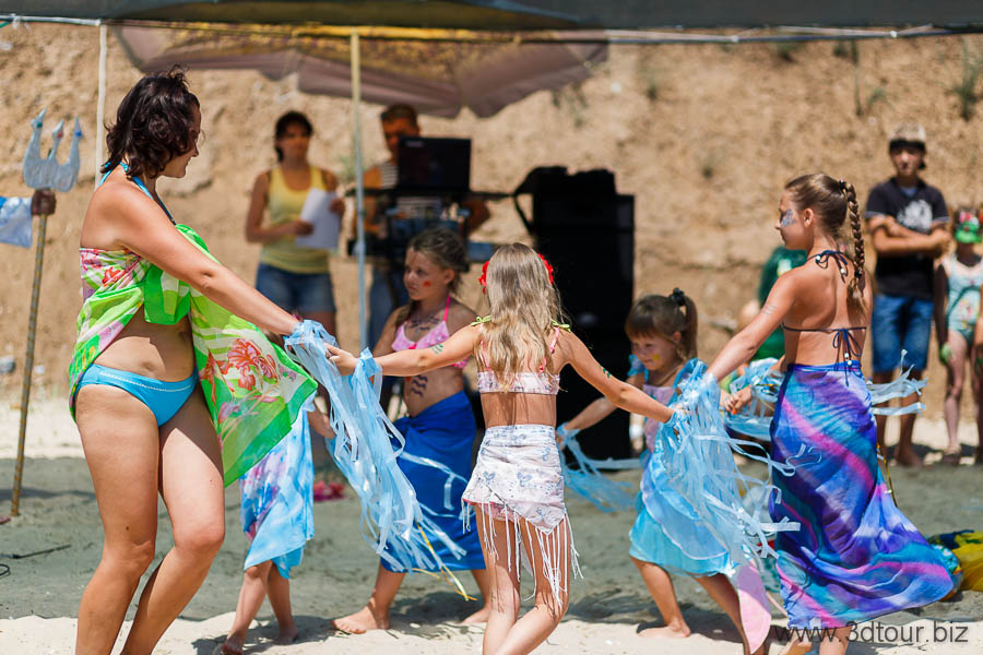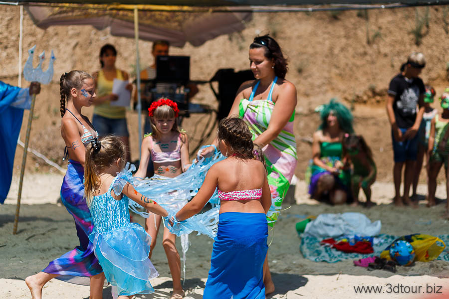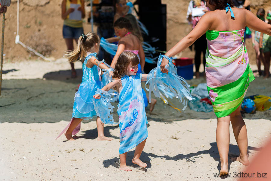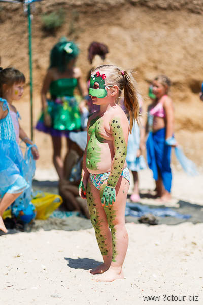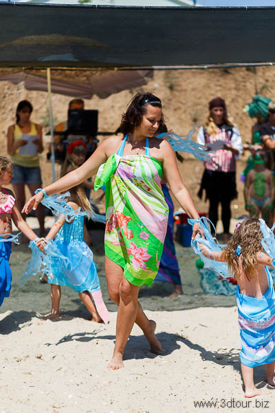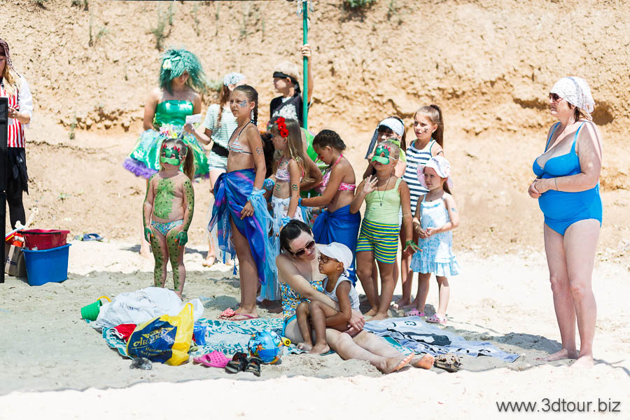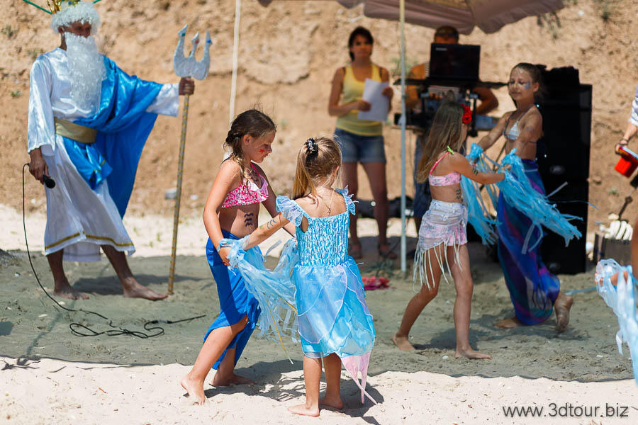 Сказочные персонажи развлекают детей на пляже. Очень весёлый праздник.