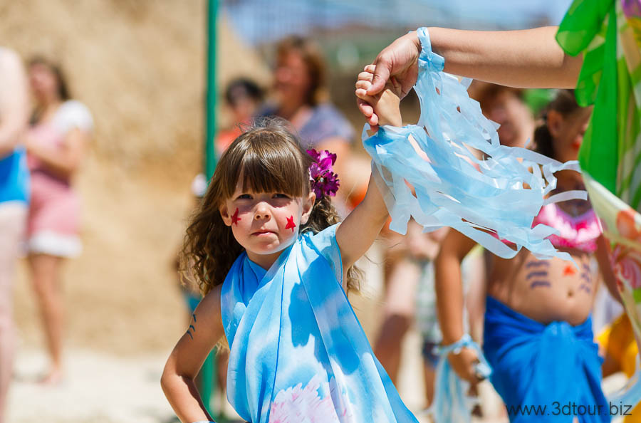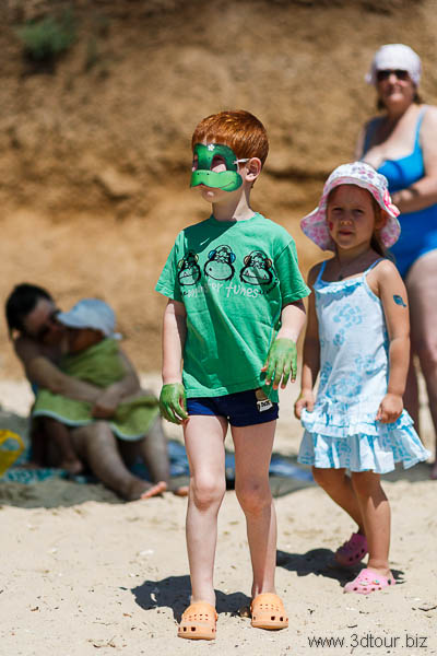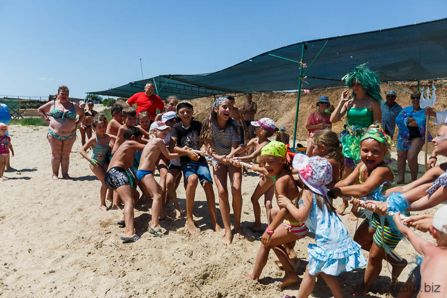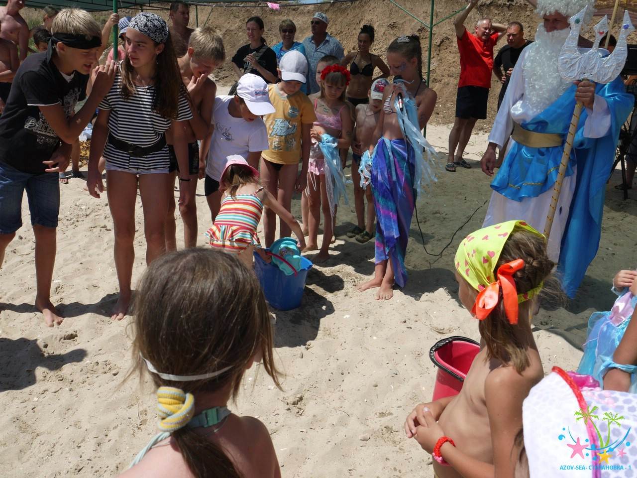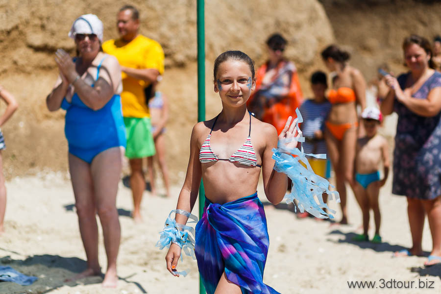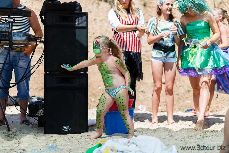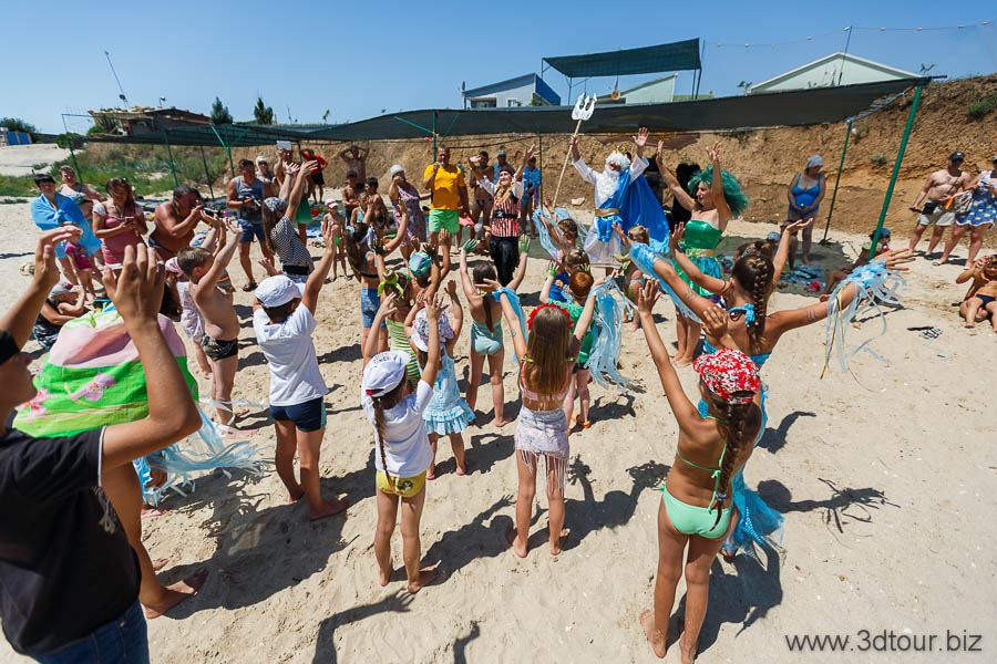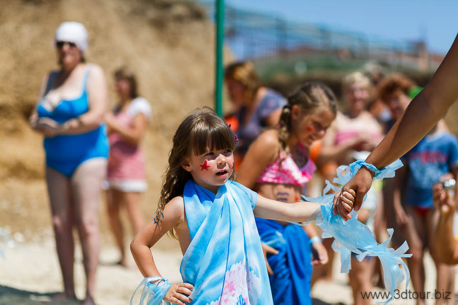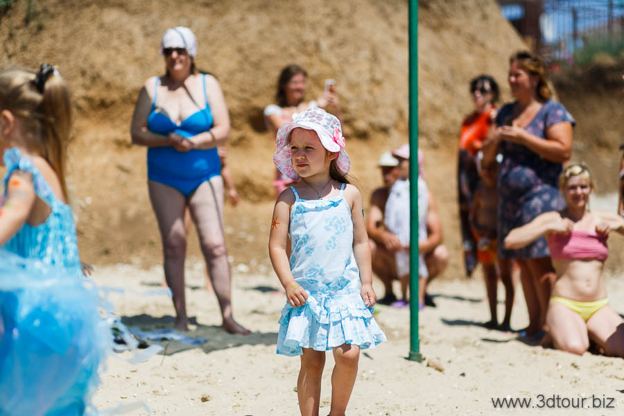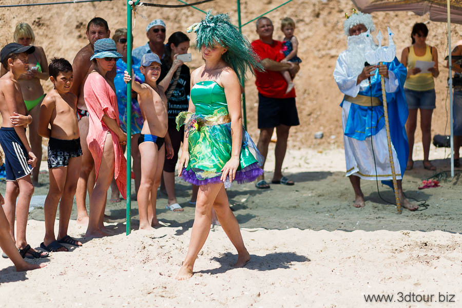 Сказочные персонажи развлекают детей на пляже. Очень весёлый праздник.