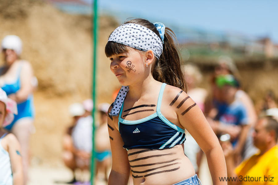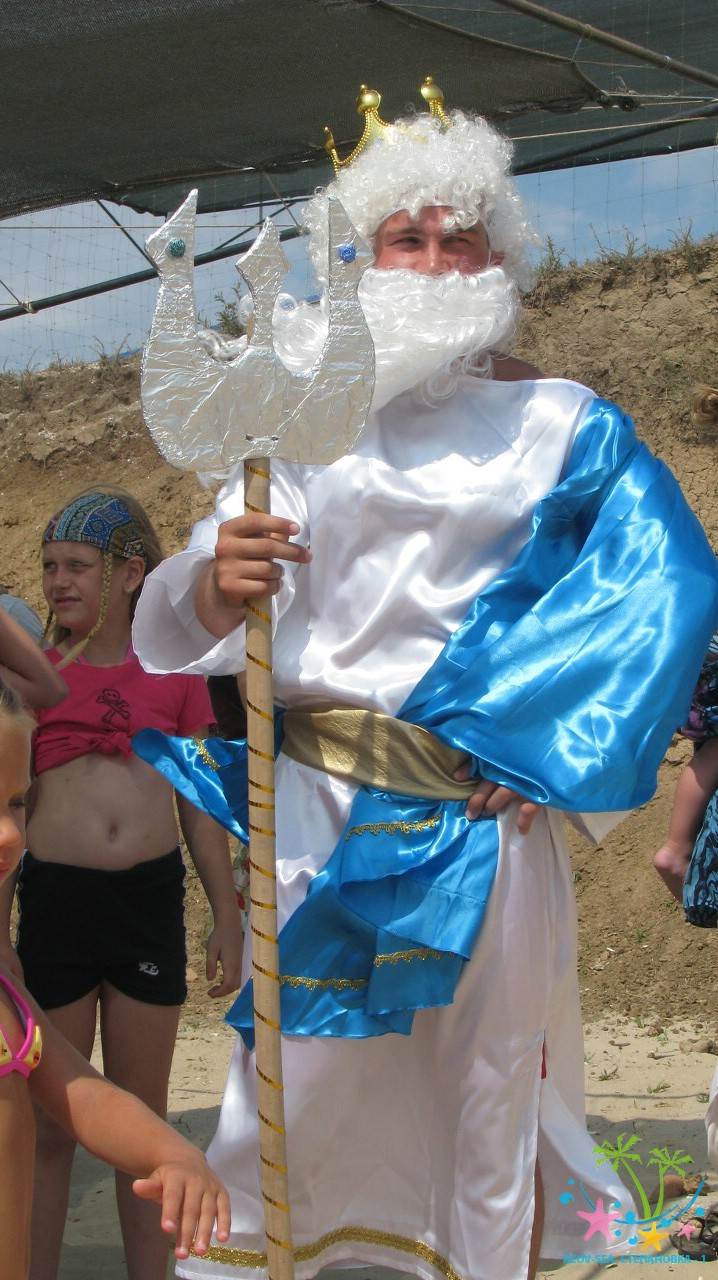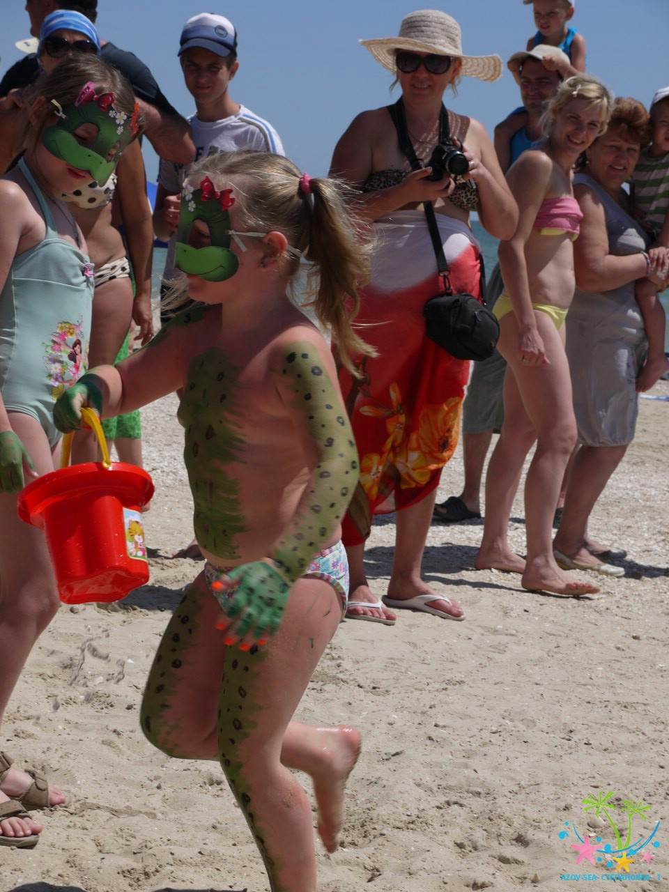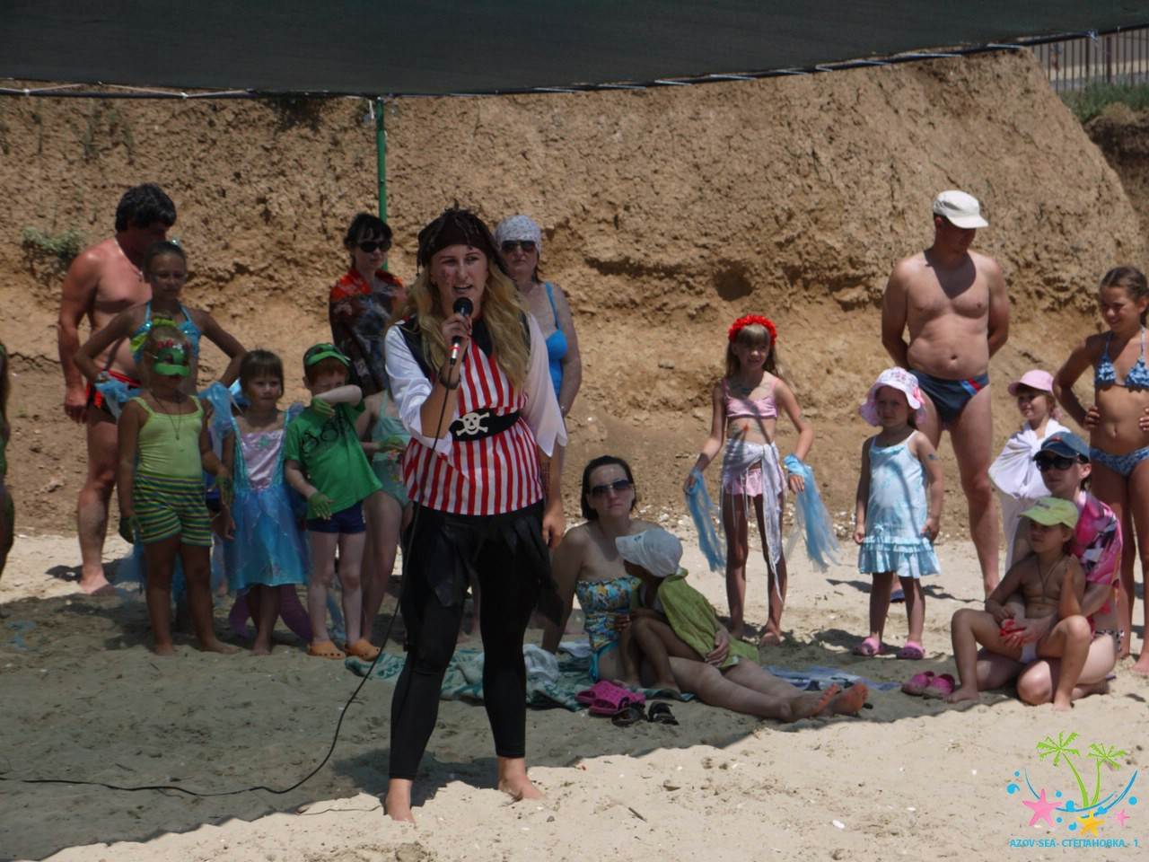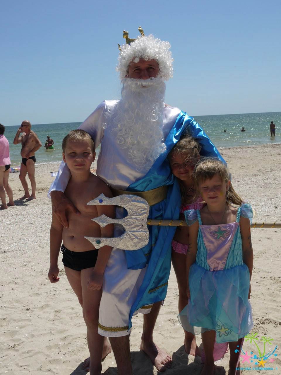Сказочные персонажи развлекают детей на пляже. Очень весёлый праздник.