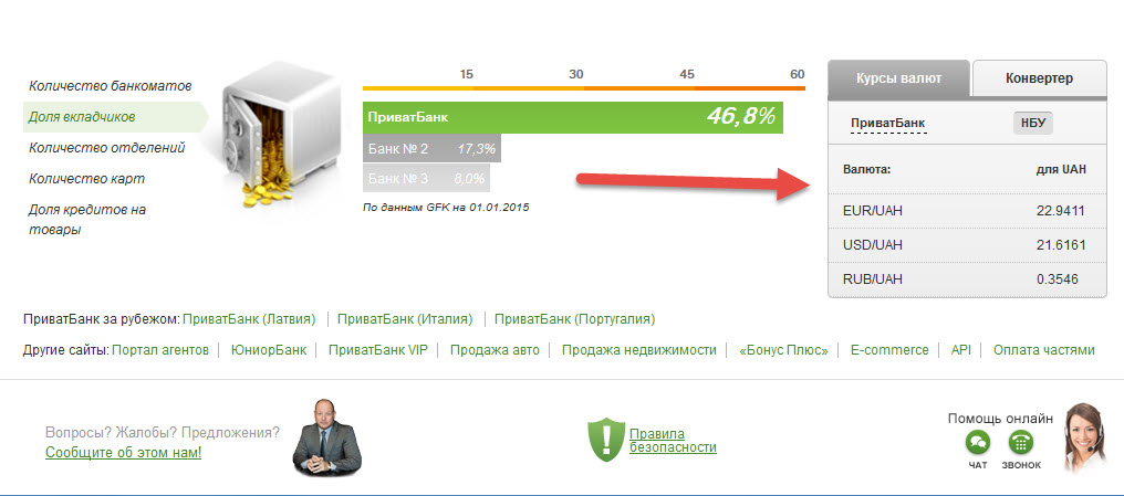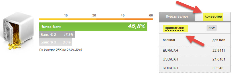 Сразу перейдите на сайт ПриватБанка и воспользуйтесь конвертером валют в правом нижнем углу. Вам нужно переключиться на вкладку "конвертер" и переключить конвертер на обменный курс ПриватБанка (изночально он установлен на курс НБУ). |